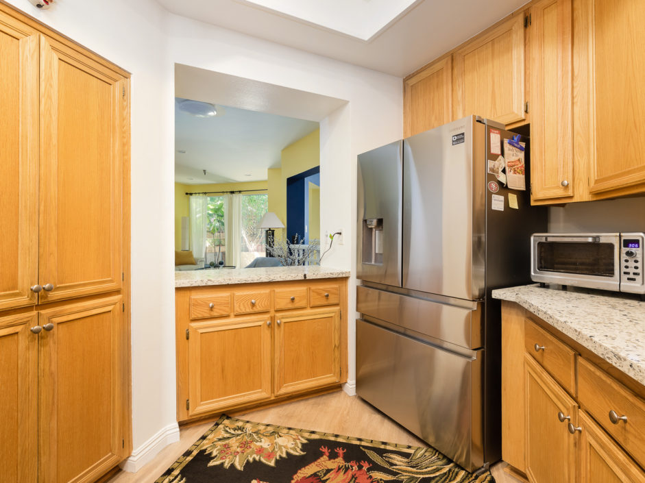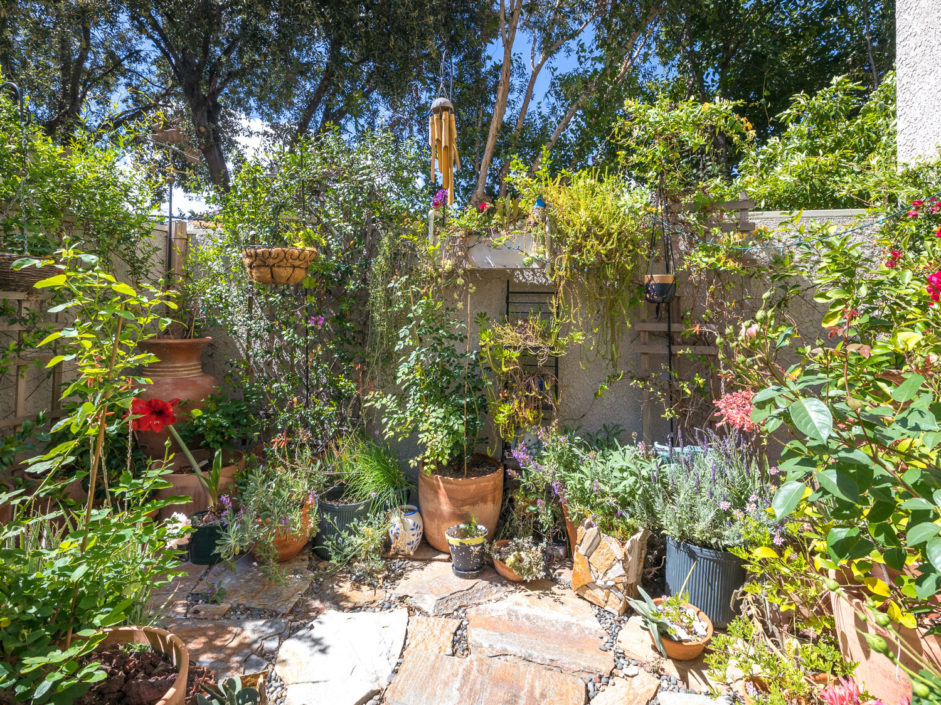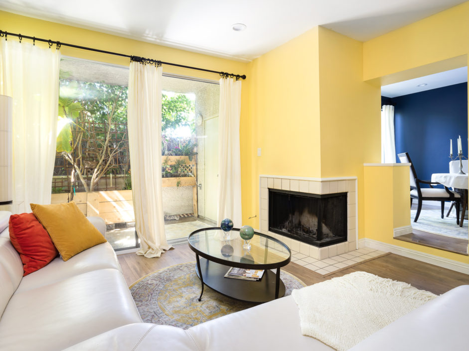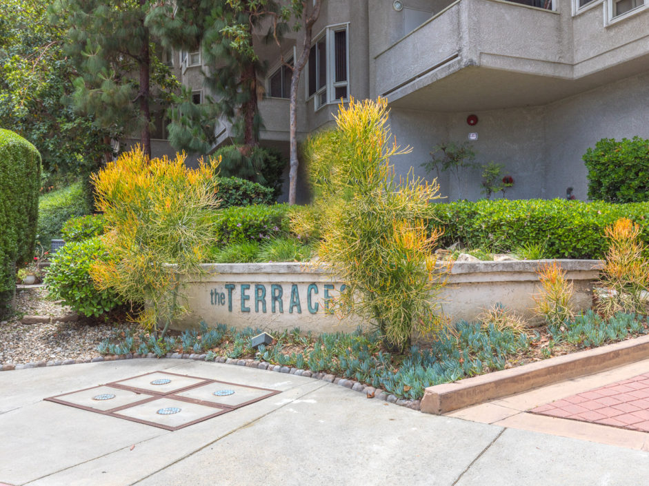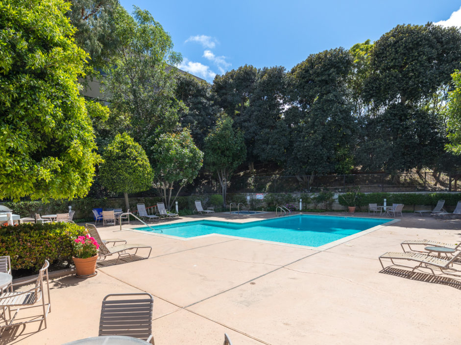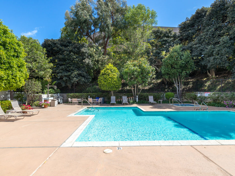 Rarely on the market this first floor unit has it all. The single level home has 1491 sq. ft. of living space and enjoys a ground level patio/yard. This remodeled up- scale unit boasts a great open floor plan with two spacious bedrooms, a huge liv- ing room, separate dining room and fireplace. Hardwood rustic floors are found throughout and create a warm feel as you enjoy all the upgrades. The attractive granite kitchen enjoys a new stainless steel appliance package including stove, microwave and double door frig with ice and water on the door. The adjoining breakfast room is sunny and spacious. The huge master bedroom with double door entry enjoys a spacious master bath with two sinks, separate shower and tub, double closets and private access to the rear yard. Not many units have the special feature of a rear yard. The yard is lushly landscaped, has stone flooring and covered patio. It’s a special place to relax after a long day. Additional features include, air conditioning, designer colors, ceiling fan, tiled entry, recessed lighting. This small 38-unit complex offers pool, spa, recreation room and exercise room. The home includes 2 parking spaces in a secured subterranean garage at the end of a quiet, tree lined cul-de-sac. Outstanding arterial access and conveniently located to exemplary shopping, theaters and numerous outstanding restaurants!