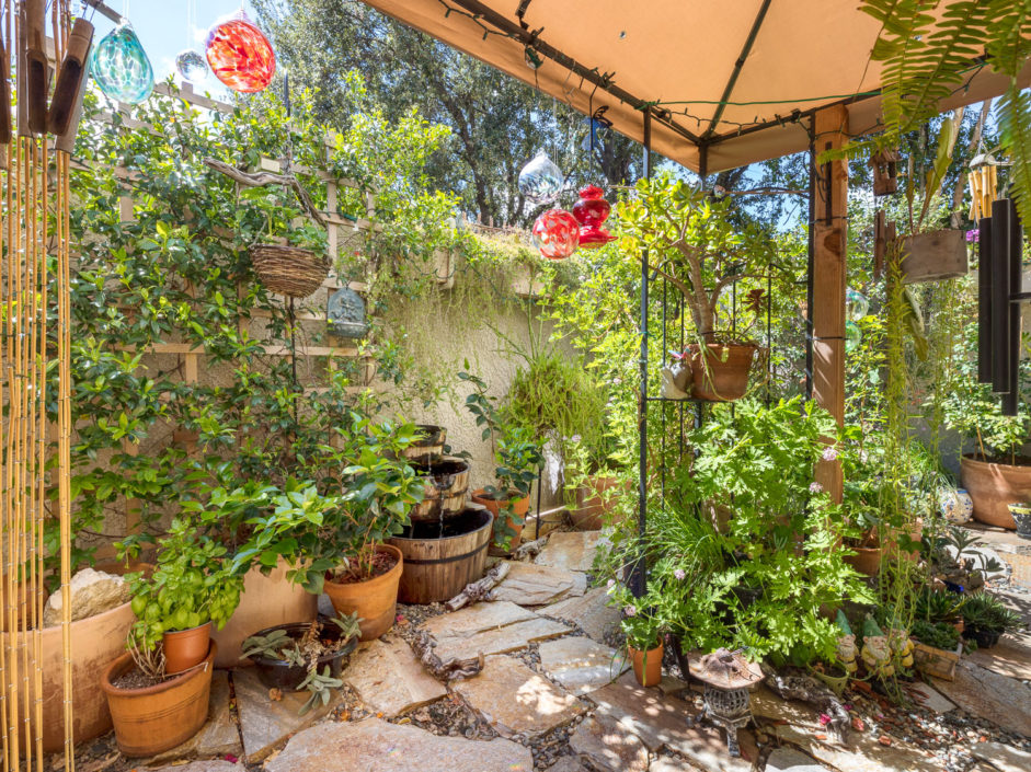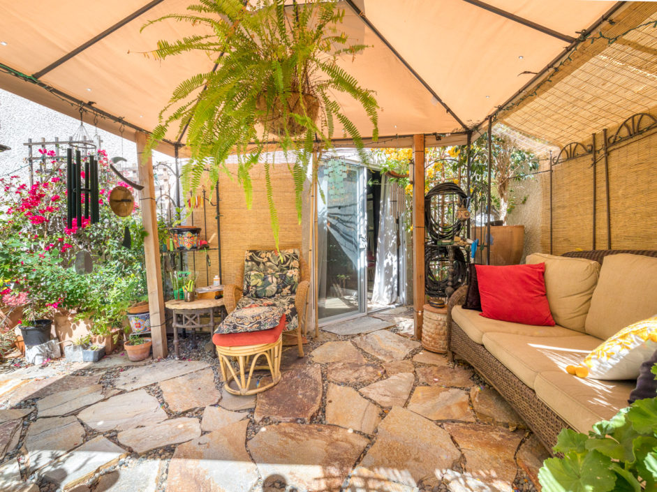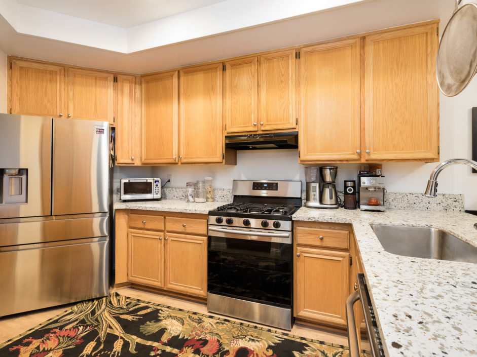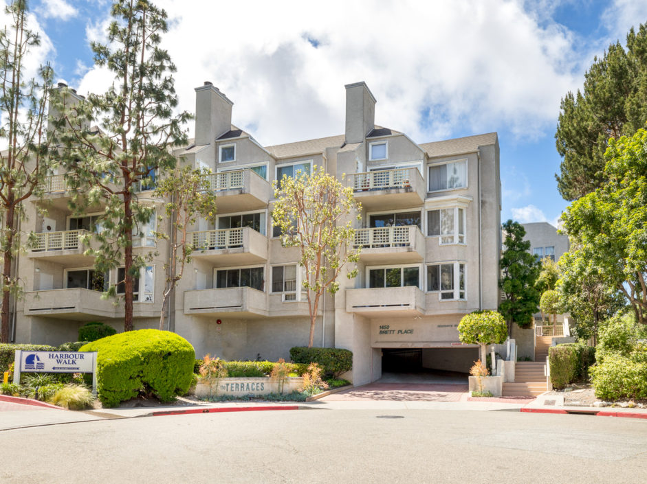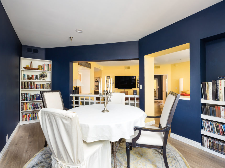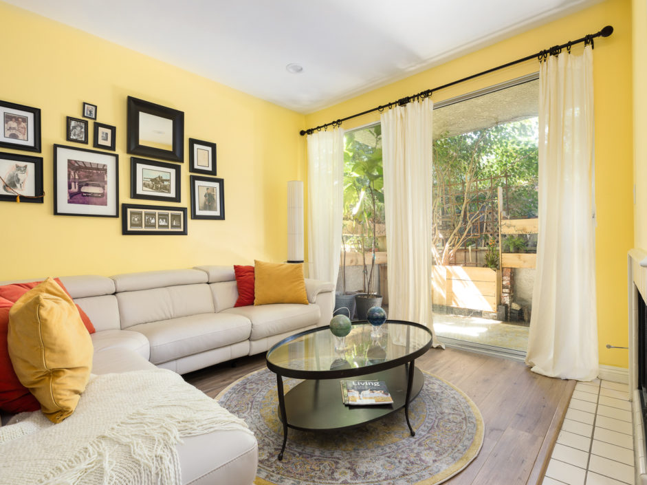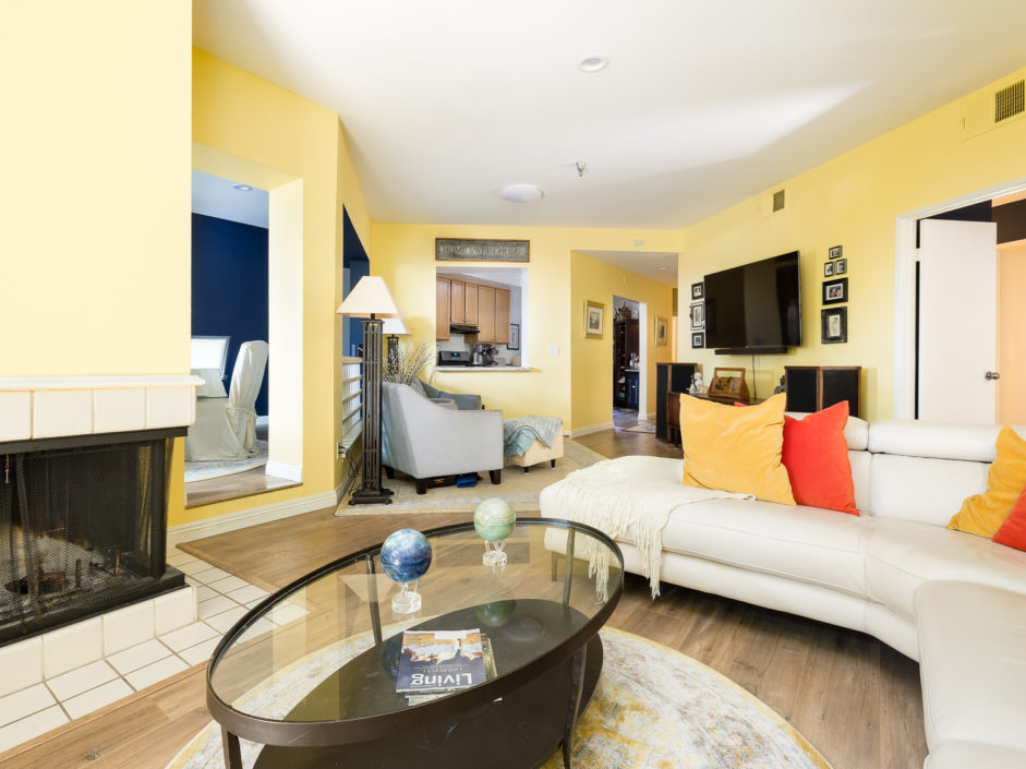 Rarely on the market this first floor unit has it all. The single level home has 1491 sq. ft. of living space and enjoys a ground level patio/yard. This remodeled up- scale unit boasts a great open floor plan with two spacious bedrooms, a huge liv- ing room, separate dining room and fireplace. Hardwood rustic floors are found throughout and create a warm feel as you enjoy all the upgrades. The attractive granite kitchen enjoys a new stainless steel appliance package including stove, microwave and double door frig with ice and water on the door. The adjoining breakfast room is sunny and spacious. The huge master bedroom with double door entry enjoys a spacious master bath with two sinks, separate shower and tub, double closets and private access to the rear yard. Not many units have the special feature of a rear yard. The yard is lushly landscaped, has stone flooring and covered patio. It’s a special place to relax after a long day. Additional features include, air conditioning, designer colors, ceiling fan, tiled entry, recessed lighting. This small 38-unit complex offers pool, spa, recreation room and exercise room. The home includes 2 parking spaces in a secured subterranean garage at the end of a quiet, tree lined cul-de-sac. Outstanding arterial access and conveniently located to exemplary shopping, theaters and numerous outstanding restaurants!