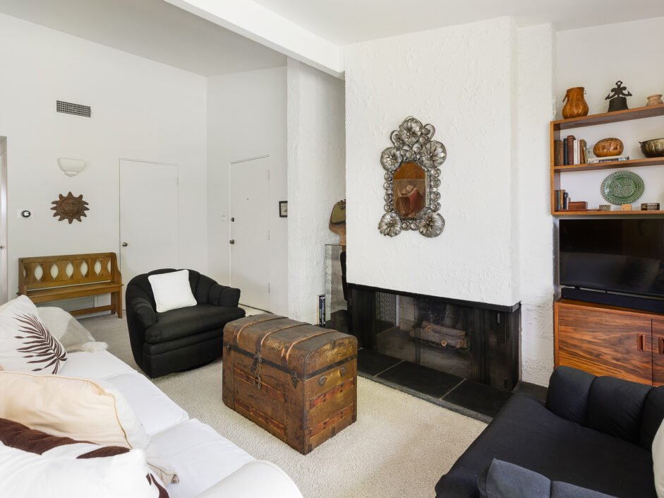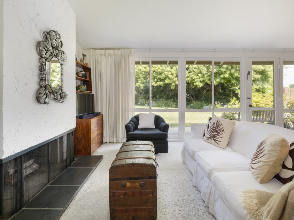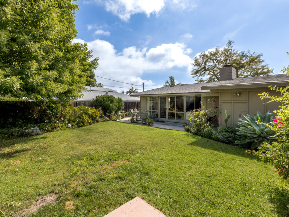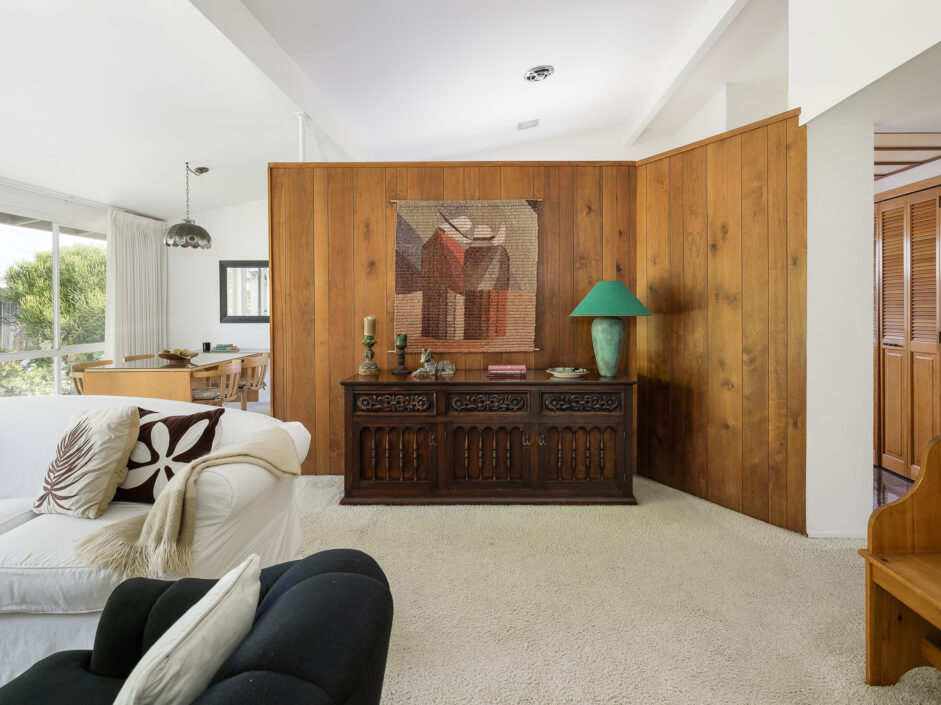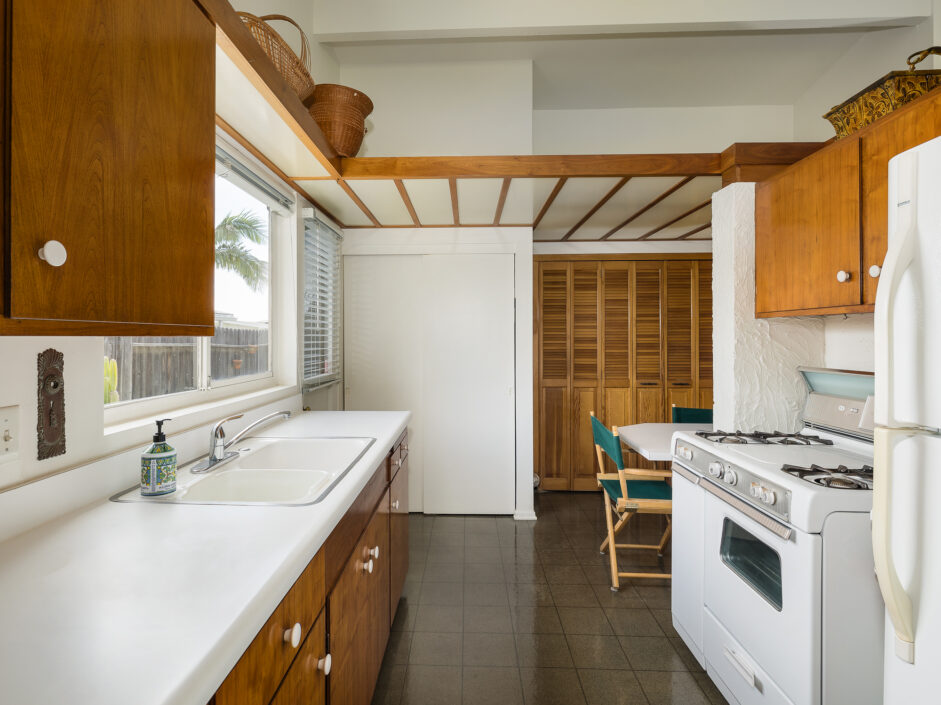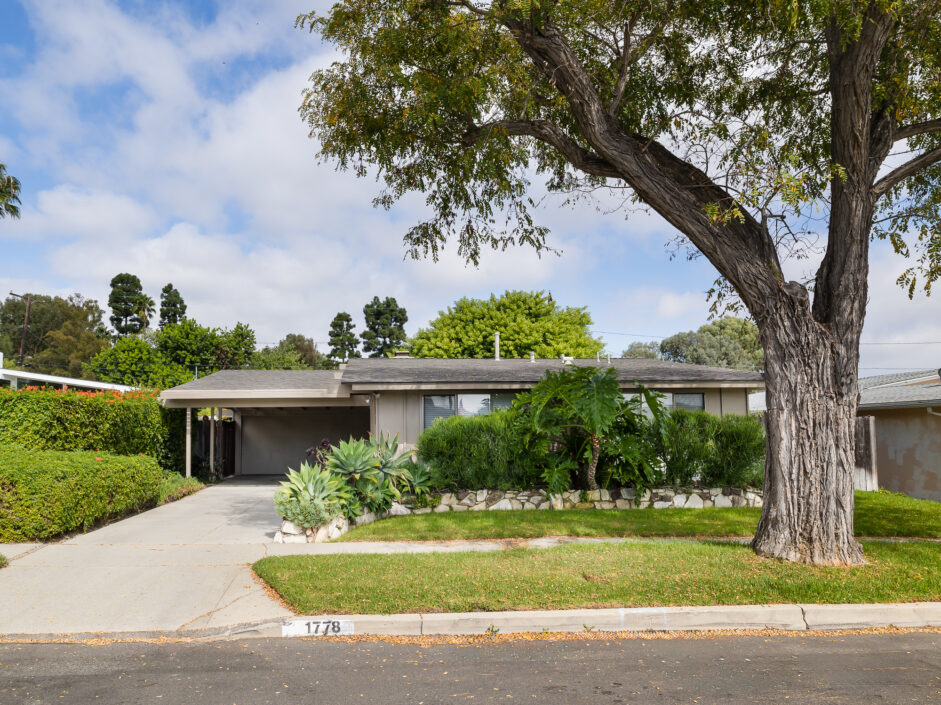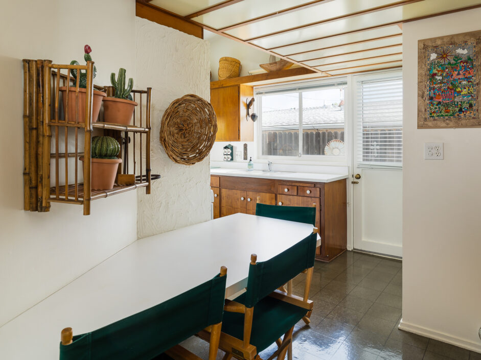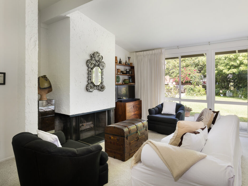 Designed by renowned architect Edward Fickett, this mid-century home emulates simple lines and angles that create a feeling of simplicity and yet a true sense of functionality. The sought after layout with sweeping roof line sets the tone the moment you walk through the front door. A period perfect fireplace anchors the open floor plan and is complimented by a wall of glass allowing the exterior to engulf the home creating a sense of serenity. The large open space living room is accented by a large wood wall. The kitchen enjoys solid walnut wood cabinetry and white counters. The dining room is a perfect area to enjoy countless gatherings. The master suite with large window includes a private full bathroom. Meticulously maintained rear grounds include a huge flat grassy yard and cozy stone fireplace sure to ensure that friends and family always want to return. This unique home is move-in ready and positioned on a quiet tree-lined street in one of San Pedro’s sought after neighborhoods.