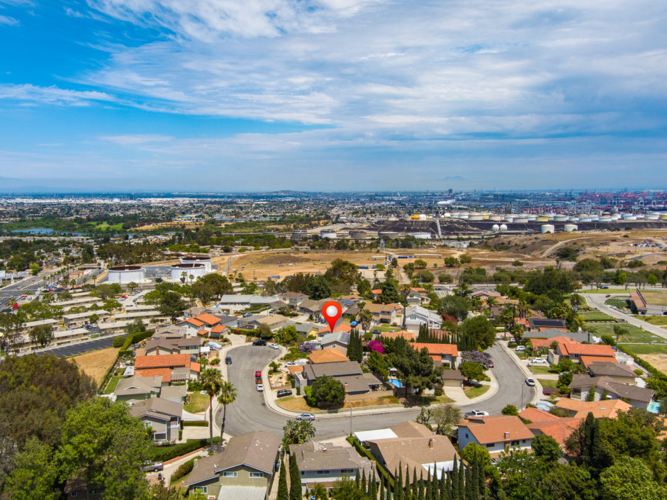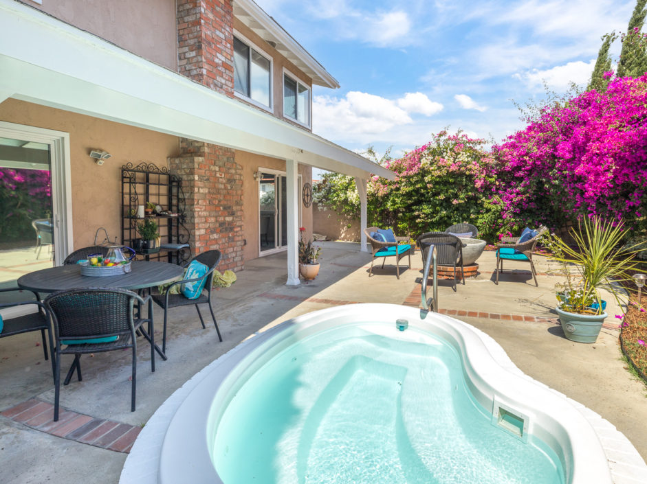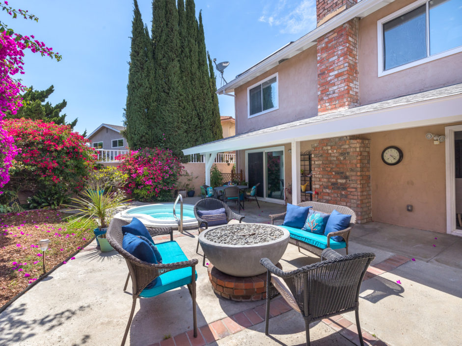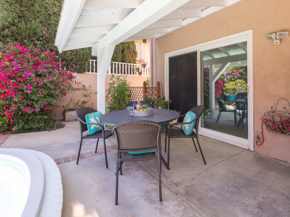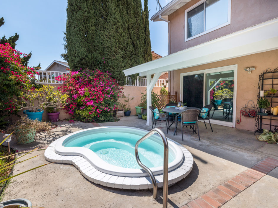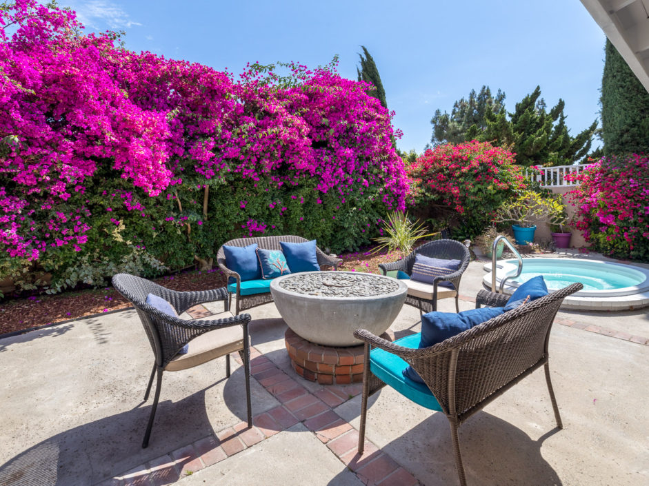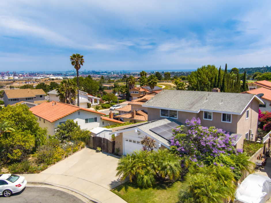 Nestled atop Peninsula Verde is a lovely home at the end of a cul-de-sac. A double door entrance is hidden behind mature flower trees that blossom in the spring. The renovated finishes enjoy a hardy tile floor that resembles hardwood, which spans the entirety of the first floor. The open air layout dances around the dining room, family room, center island, and gourmet kitchen. This chef’s delight mixes vanilla hues and creamy colors seen in the custom cabinetry, granite stone counters, and accordingly accented backsplash. Stainless steel appliances are of the highest grade. Thermador range, frig, dishwasher, Sharp microwave, and Monogram wine cooler. The window placement invites tremendous natural light and views beyond to white, pink, magenta, and purple bougainvilleas that fantastically fan around the property. The two sliding doors make way towards the gorgeous backyard that encases a fire pit, jacuzzi, shaded wood structure, and a side yard that utilizes morning sun for gardening. This area also has access to the homes energy conserving solar panels, completely owned by the property, which are run by a Tesla 11kW system. The home takes a waltz upstairs to the bedroom quarters. This area of the home picks up perfect views. A colorful drape of sheer flowers encompasses the downstairs while bright blue sky and the green hills of Palos Verdes cascade down and can be seen from bedrooms upstairs. The master bath enjoys views from the East which include the ocean, sunrises, Vincent Thomas, and a glass wall within the room that bounces these natural lights back into the master bedroom. Large walk-in closet, linen space, full baths, and direct 2-car garage access create an efficient use of space perched on a pleasant hillside.