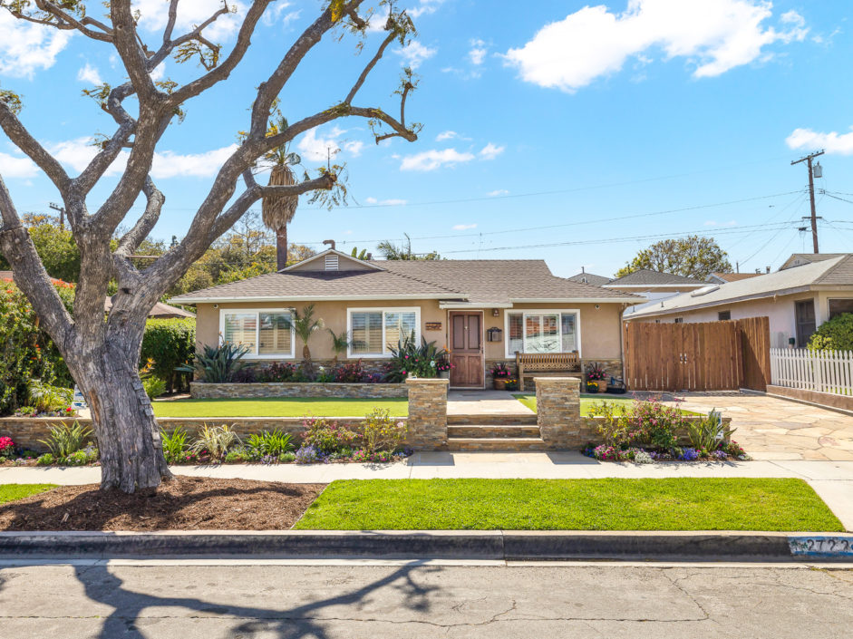 Nestled in the warmth of Walteria. Dalemead is thoughtfully designed throughout the interior and exterior features. Low maintenance drought resistant plants, astroturf, plantation shutters, rain gutters, and stack stone squares off the front facade. The remodeled aspects continue to through the entirety of the property. Hardwood floors, newer windows, LED lighting, bullnose cream walls, and an inviting open layout. The kitchen has bright granite countertops complimented by rich wood cabinetry with river stone colored backsplash around the stainless steel appliances. The family room rises up to high ceilings that allow bountiful natural light to spring in through windows and the french double door entrance to the backyard. The bohemian backyard has lush undertones, vibrant tropical vegetation, hardscaped where needed and space for personal touch. The home houses 4 bedrooms and immaculately designed bathrooms. The master enjoys a double sink brilliant cabinetry, and quartz everything. Laundry room in the home. The dog run houses 2 A/C condensers and the separate side yard has ample space leading up to the finished 2-car garage.