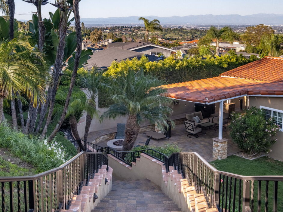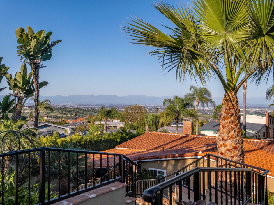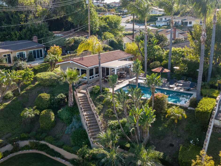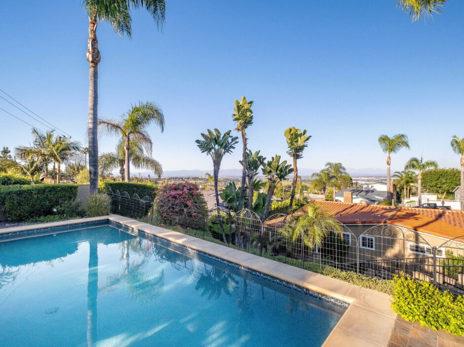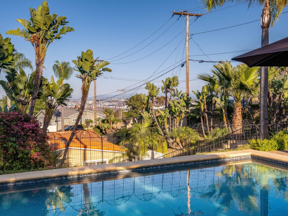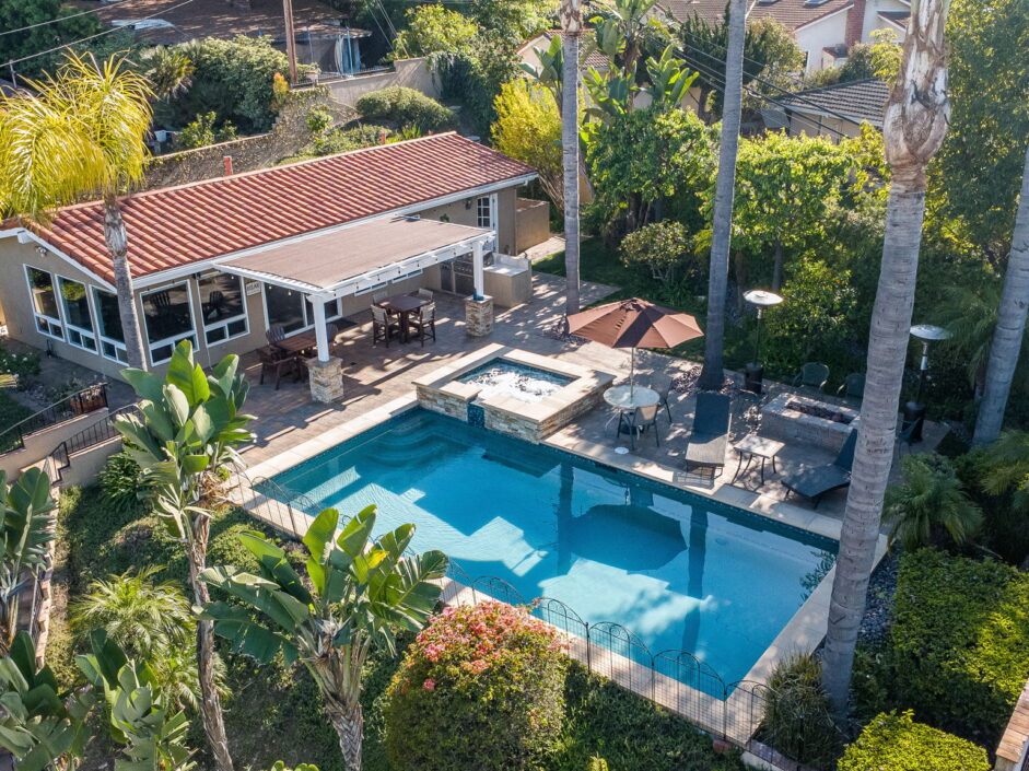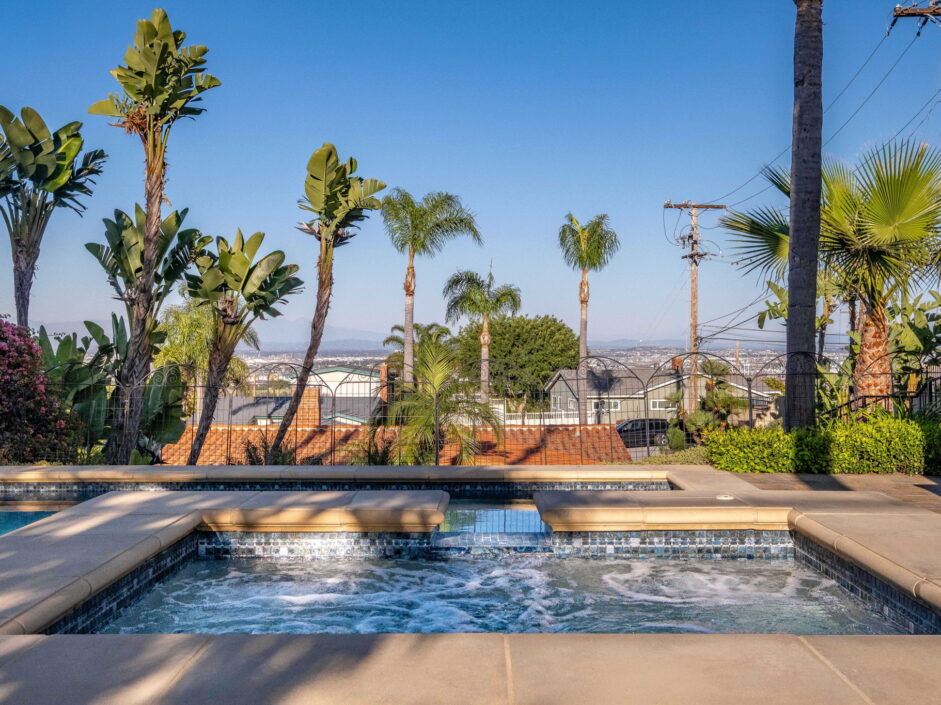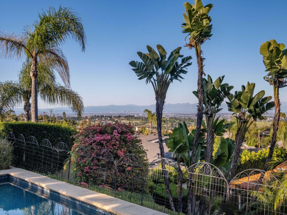 Enjoy resort-style living in this beautifully situated 3-bedroom, 2-bathroom home in Rancho Palos Verdes, offering breathtaking panoramic views from the Hollywood sign to downtown Los Angeles, the Queen Mary, the ocean, and surrounding mountains. The main residence features an inviting open floor plan, where the cozy granite kitchen flows seamlessly into the living room, highlighted by a charming stone fireplace and refinished wood flooring throughout. The kitchen includes LG appliances, a KitchenAid dishwasher, wine refrigerator and convenient indoor laundry just off the kitchen. Enjoy Al fresco dining off the covered patio that opens to a fire feature and large grassy yard. Situated on an expansive 10,000 sqft plus lot, the property also includes a separate 767 sqft back house with vaulted inlaid wood ceilings and a wall of glass creating the ultimate first impression. Complete with its own kitchen and bathroom, offering excellent flexibility for guests, extended family, or additional workspace. The outdoor space is a private fenced oasis, designed for both relaxation and entertaining. A sparkling pool and spa sits in front of the back house, perfectly positioned to capture the sweeping city, harbor, and ocean views. The grounds feature an expansive covered patio complimented with interlocking pavers and multiple fruit trees including lemon, tangerine, apple, and pomegranate, along with an outdoor grill and two outdoor fireplaces, creating the perfect setting for enjoying Southern California evenings. Located in a quiet neighborhood, this unique property combines privacy, award winning Palos Verdes Schools, stunning views and the feel of true resort-style living in Rancho Palos Verdes.