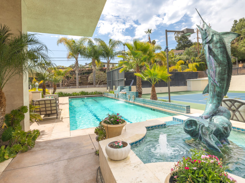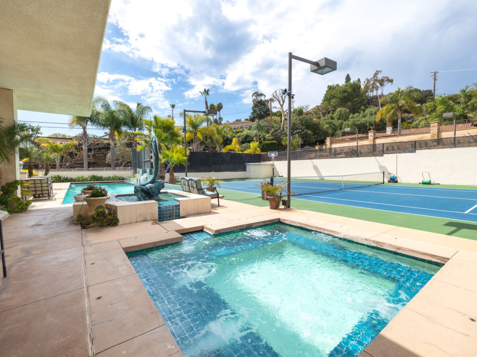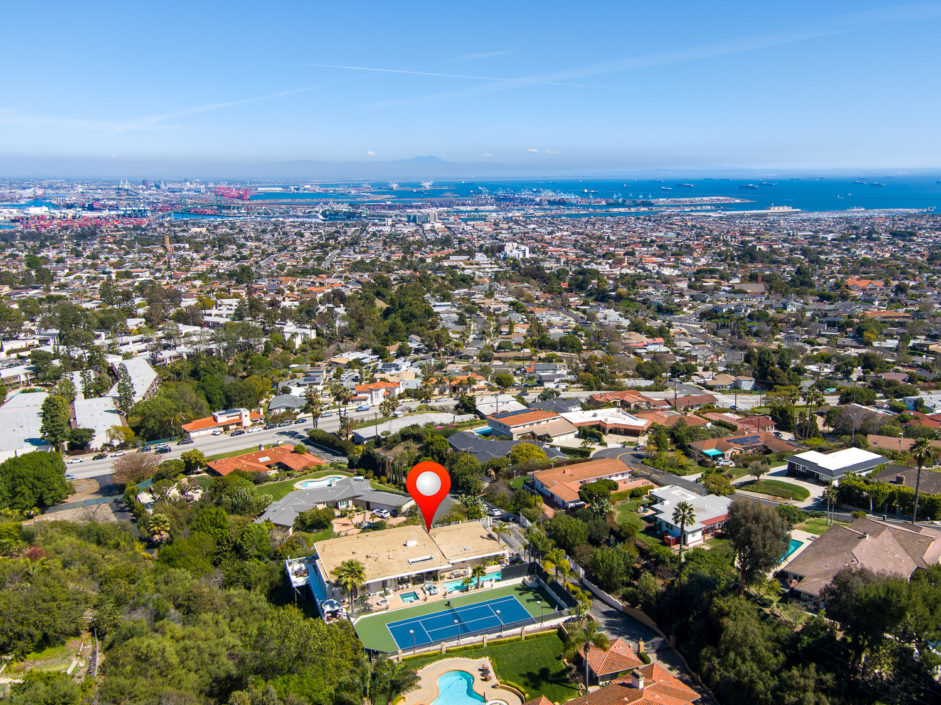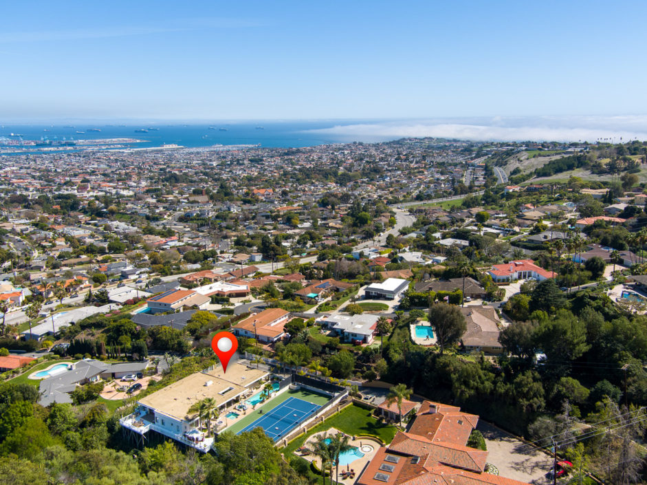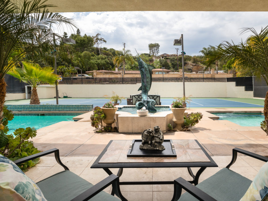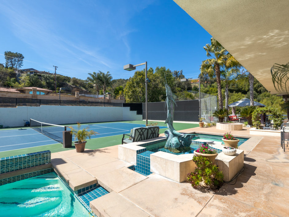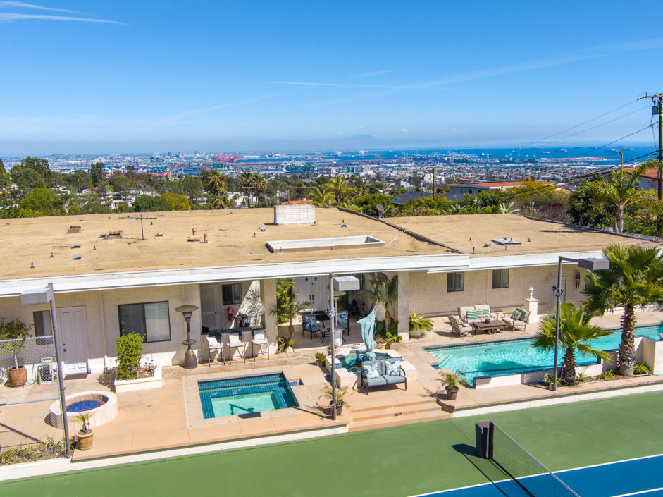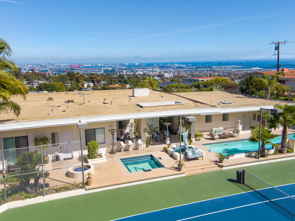 Gated tennis estate in Palos Verdes with panoramic harbor and ocean views positioned on a 32,000 sq.ft. lot. The rare regulation sized tennis court is lighted and situated next to a 45 foot swimming pool and spa with waterfall features, automatic cover, and fiber optic outdoor lighting and sound system. The center fountain feeds into both the pool and an adjacent oversized Jacuzzi. Contains over 1000 square feet of covered patio decks, beautiful landscaping, fire pit, cabana, outdoor wet bar and gas BBQ ideal for outdoor enjoyment and perfect for entertaining. Harbor views in a pastoral canyon setting. Home was completely remodeled in 2014, including a separated guest suite. The gourmet kitchen is encased in granite counters and designer cabinets. A stainless appliance package completes the culinary experience. Large master suite with huge walk-in closet. Additional features include 8 foot doors, air conditioning, and huge grassy side yard. Three car garage with outdoor covered parking for boat or RV. This home is not situated on Miraleste Drive but rather toward the end of a private street called Rich Lane with gated access.