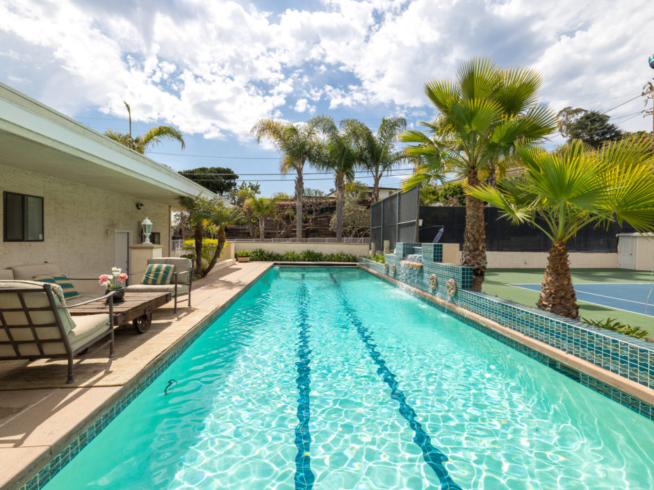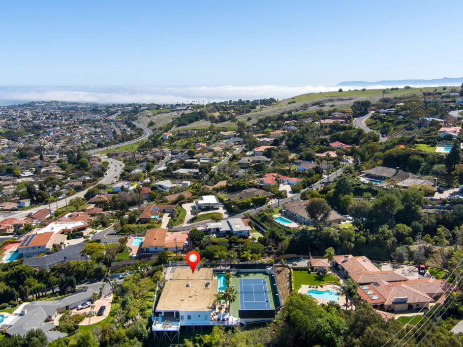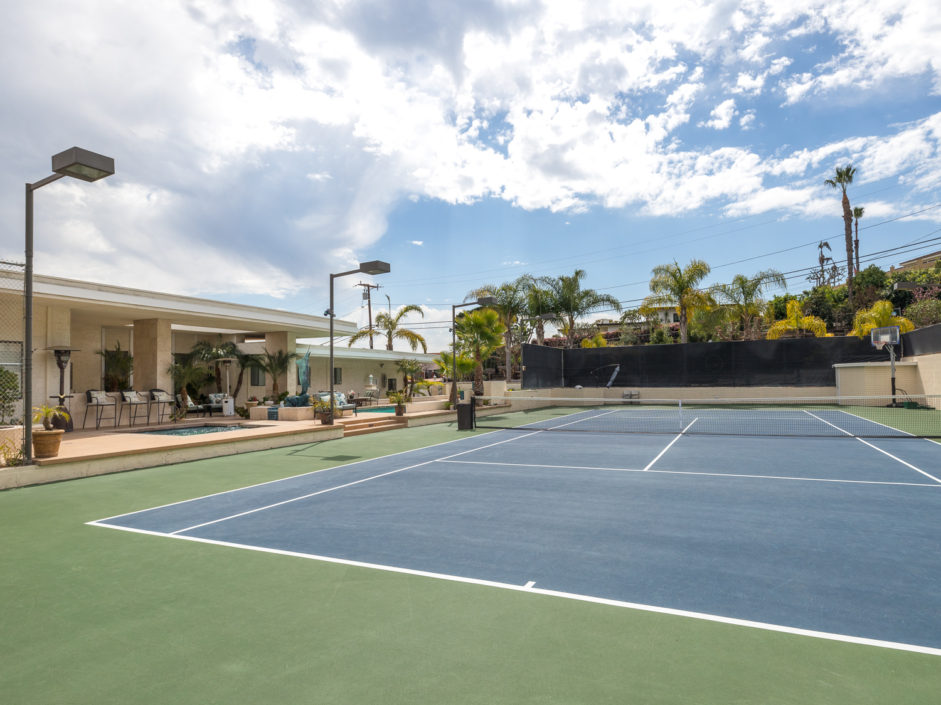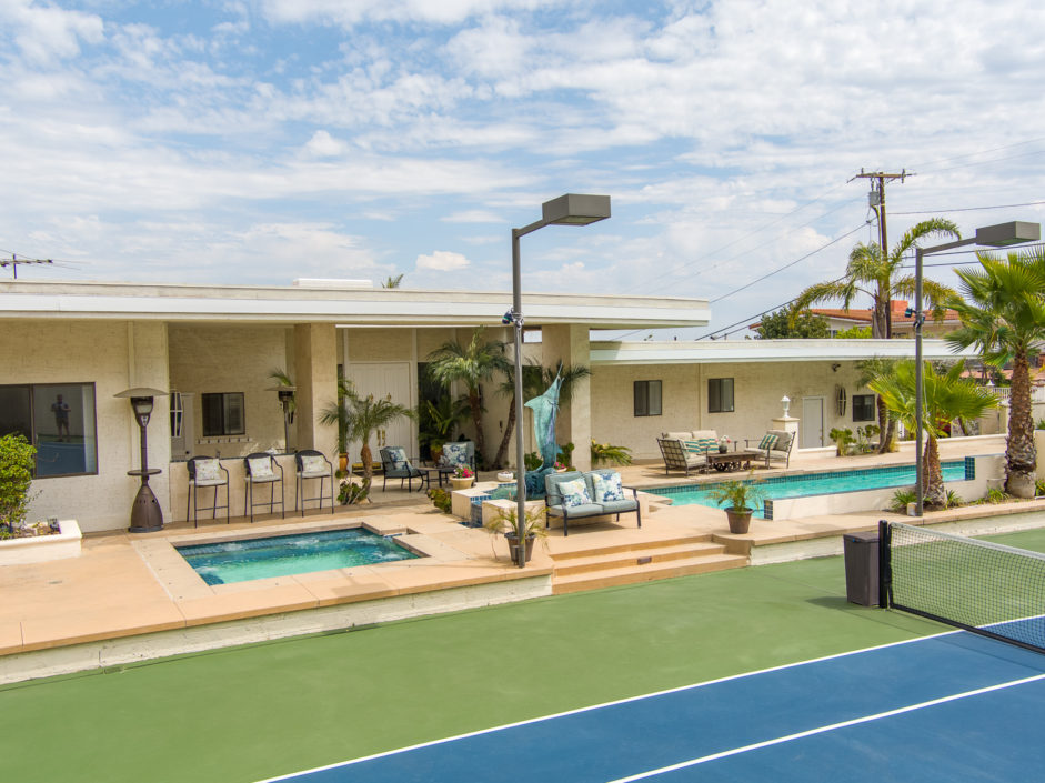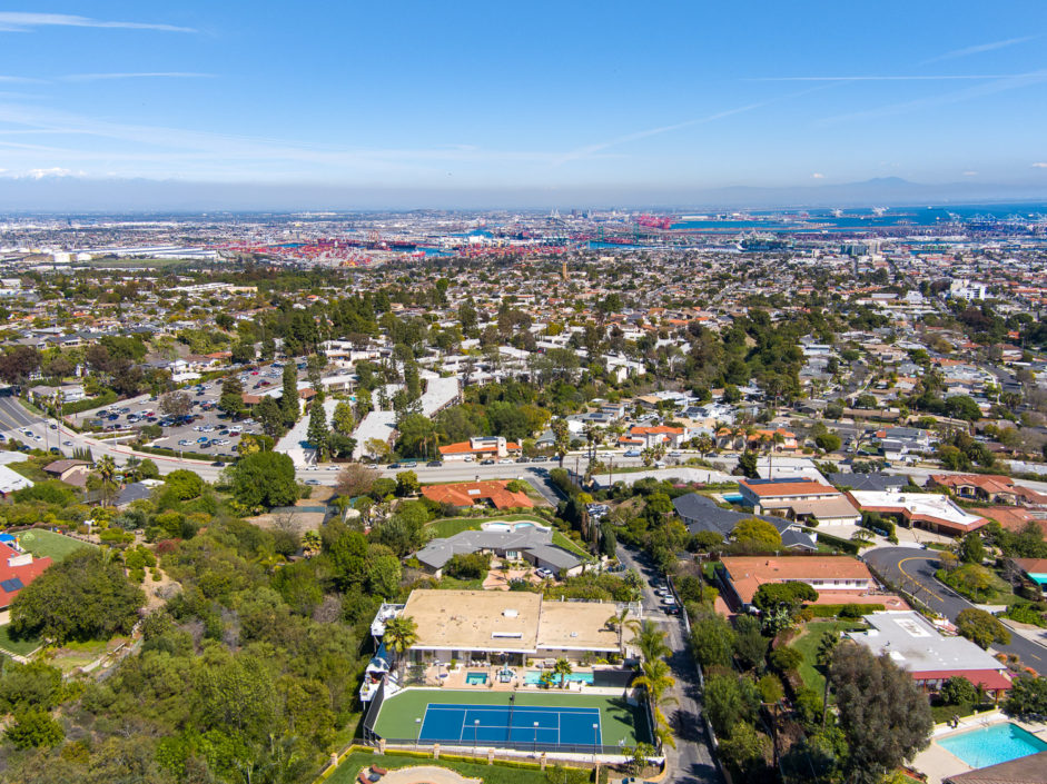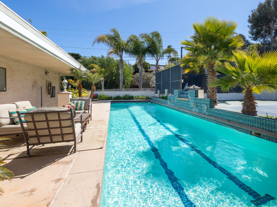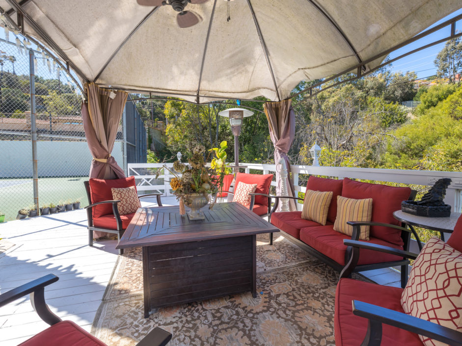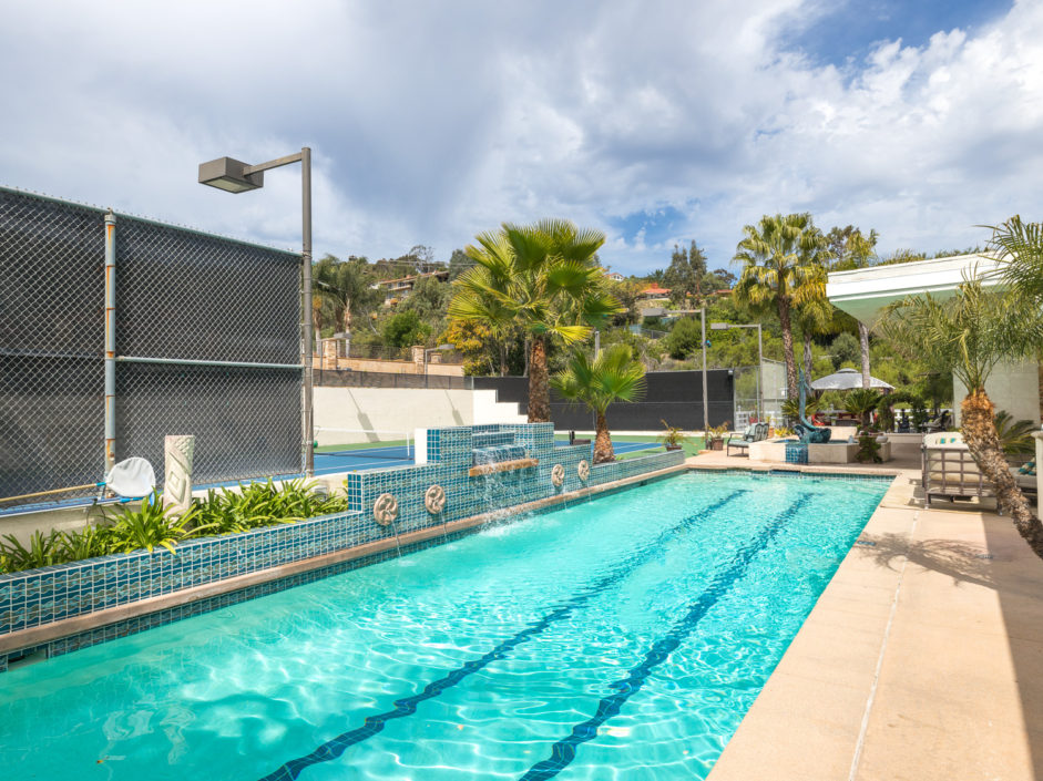 Gated tennis estate in Palos Verdes with panoramic harbor and ocean views positioned on a 32,000 sq.ft. lot. The rare regulation sized tennis court is lighted and situated next to a 45 foot swimming pool and spa with waterfall features, automatic cover, and fiber optic outdoor lighting and sound system. The center fountain feeds into both the pool and an adjacent oversized Jacuzzi. Contains over 1000 square feet of covered patio decks, beautiful landscaping, fire pit, cabana, outdoor wet bar and gas BBQ ideal for outdoor enjoyment and perfect for entertaining. Harbor views in a pastoral canyon setting. Home was completely remodeled in 2014, including a separated guest suite. The gourmet kitchen is encased in granite counters and designer cabinets. A stainless appliance package completes the culinary experience. Large master suite with huge walk-in closet. Additional features include 8 foot doors, air conditioning, and huge grassy side yard. Three car garage with outdoor covered parking for boat or RV. This home is not situated on Miraleste Drive but rather toward the end of a private street called Rich Lane with gated access.