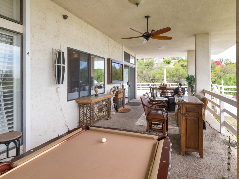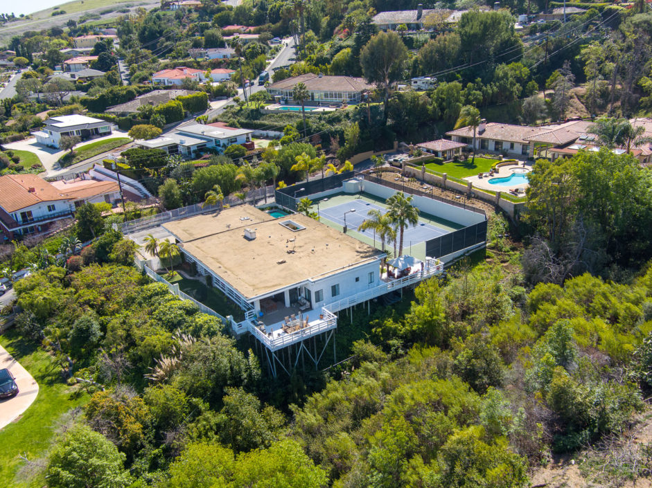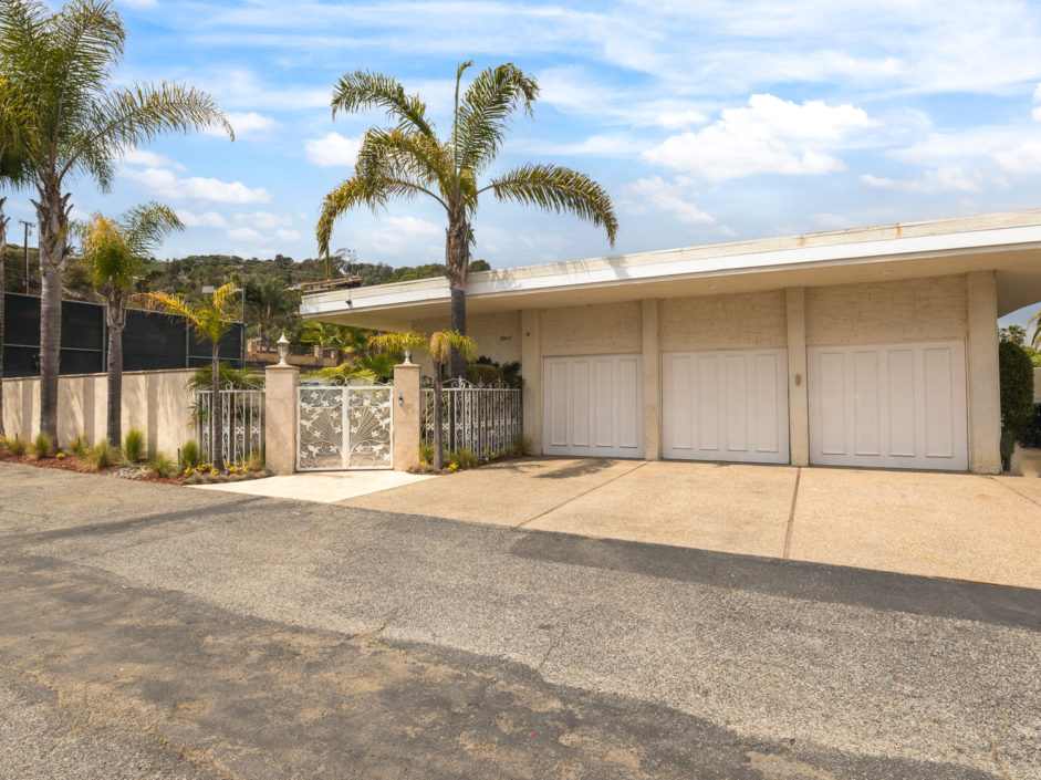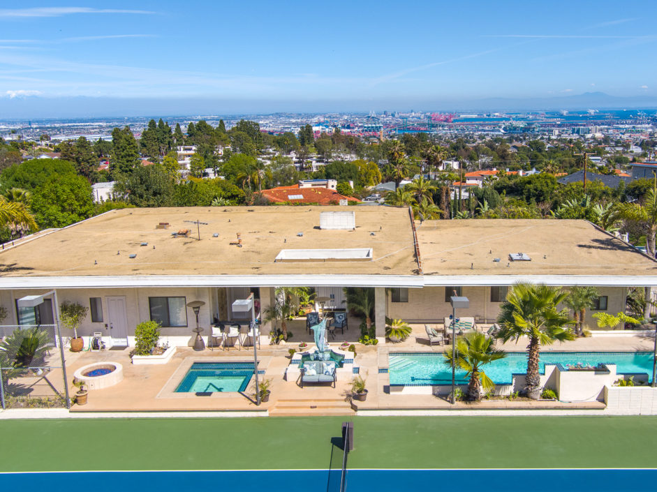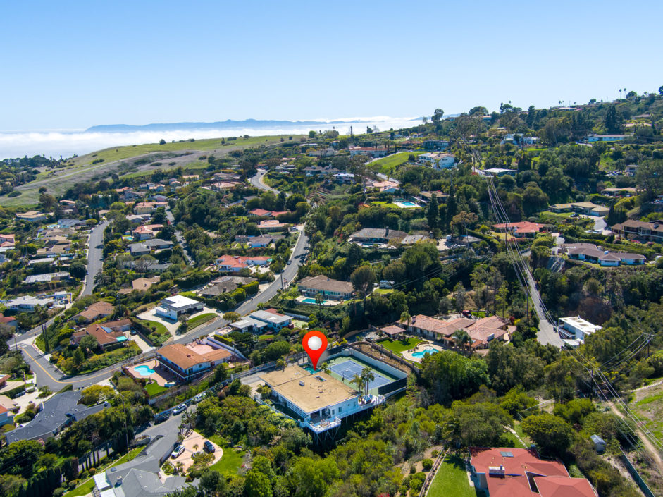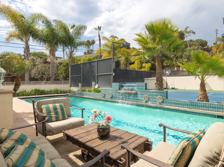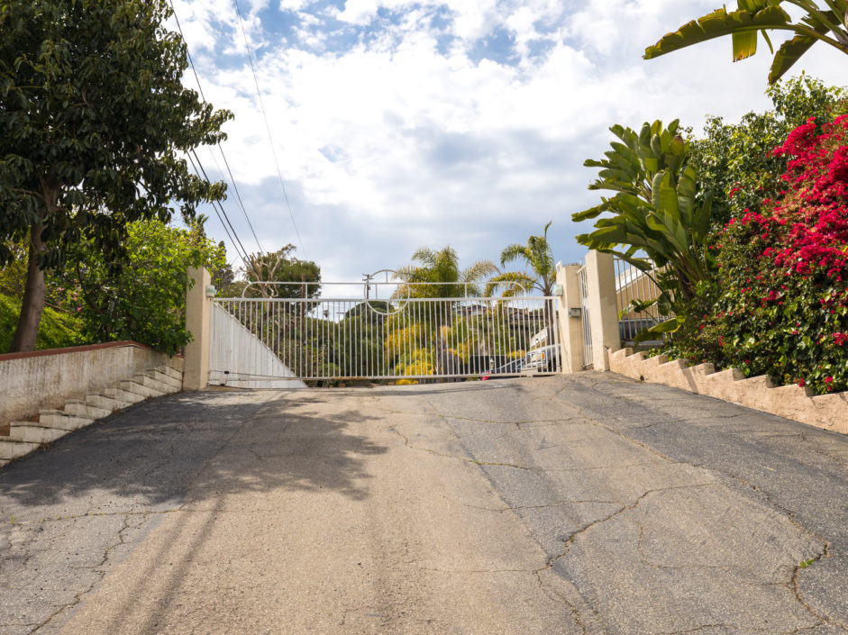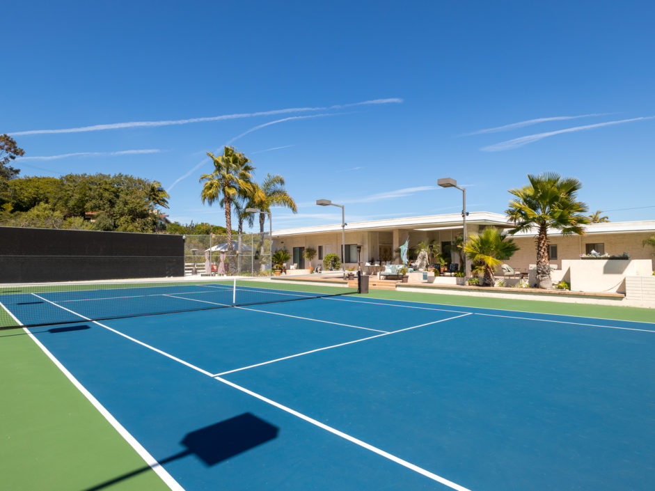 Gated tennis estate in Palos Verdes with panoramic harbor and ocean views positioned on a 32,000 sq.ft. lot. The rare regulation sized tennis court is lighted and situated next to a 45 foot swimming pool and spa with waterfall features, automatic cover, and fiber optic outdoor lighting and sound system. The center fountain feeds into both the pool and an adjacent oversized Jacuzzi. Contains over 1000 square feet of covered patio decks, beautiful landscaping, fire pit, cabana, outdoor wet bar and gas BBQ ideal for outdoor enjoyment and perfect for entertaining. Harbor views in a pastoral canyon setting. Home was completely remodeled in 2014, including a separated guest suite. The gourmet kitchen is encased in granite counters and designer cabinets. A stainless appliance package completes the culinary experience. Large master suite with huge walk-in closet. Additional features include 8 foot doors, air conditioning, and huge grassy side yard. Three car garage with outdoor covered parking for boat or RV. This home is not situated on Miraleste Drive but rather toward the end of a private street called Rich Lane with gated access.