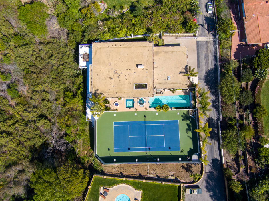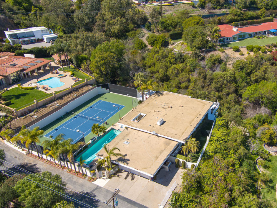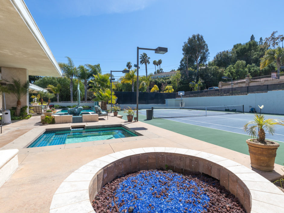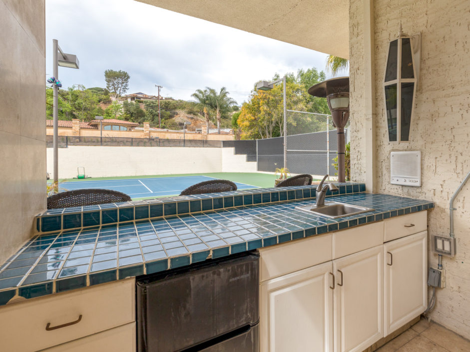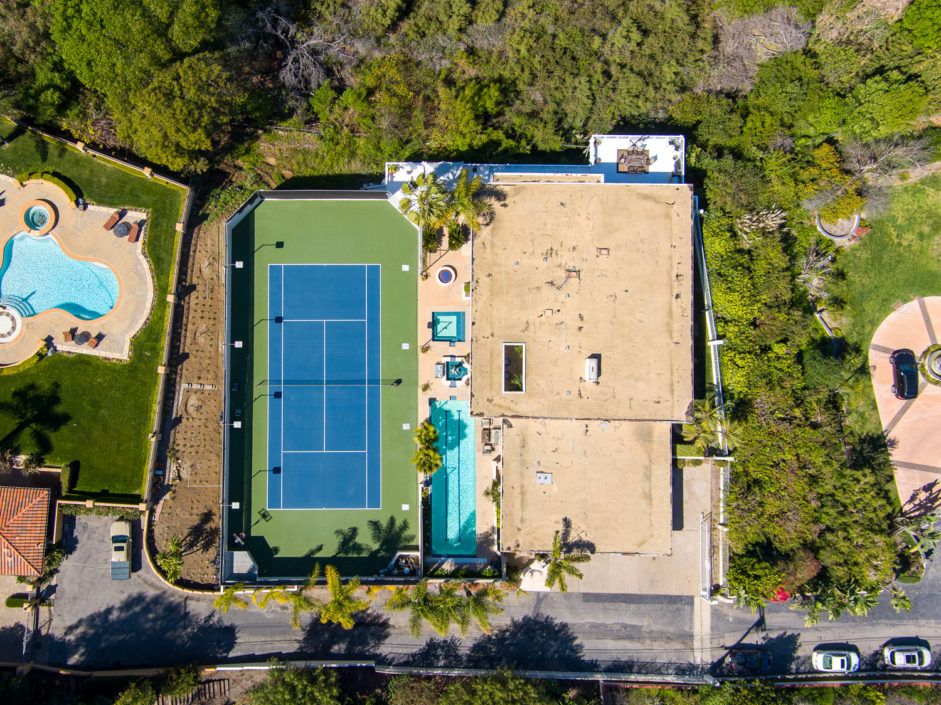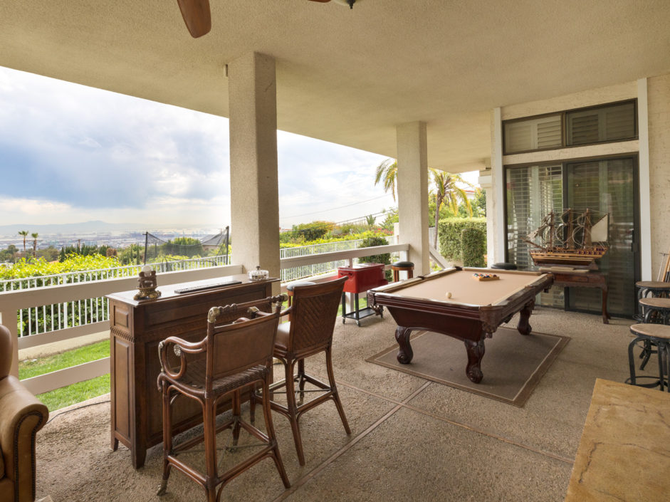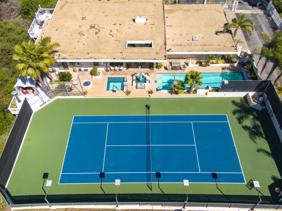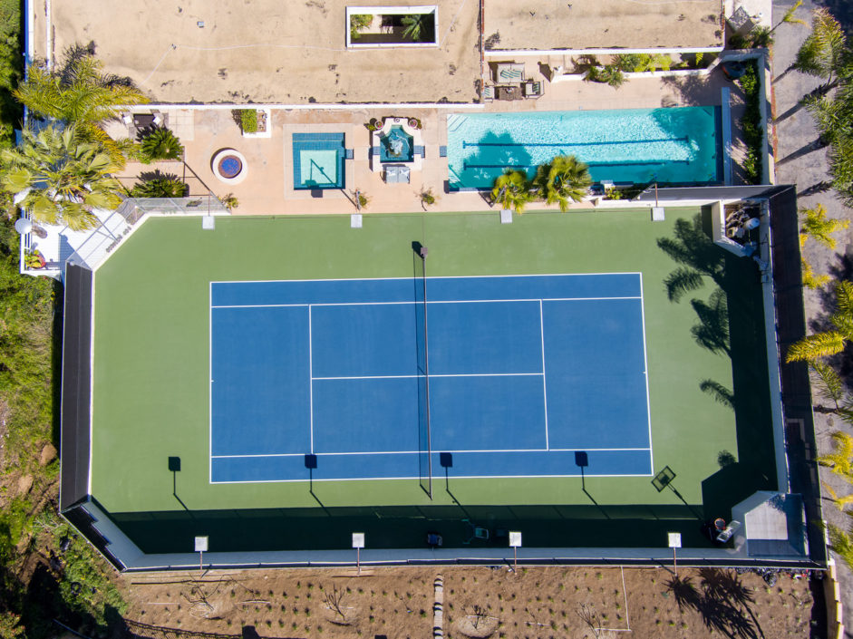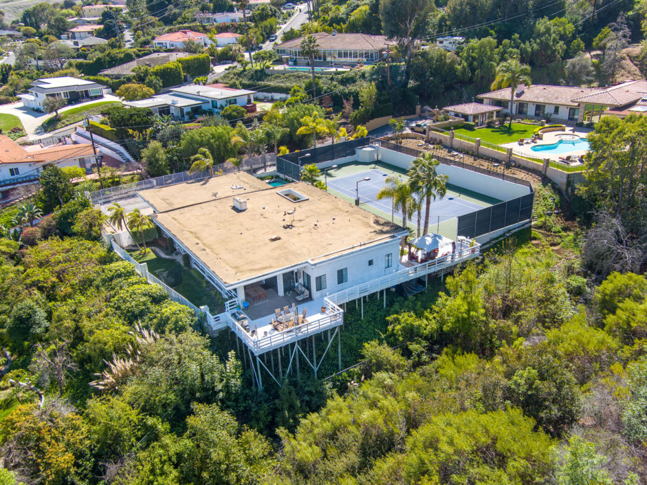Gated tennis estate in Palos Verdes with panoramic harbor and ocean views positioned on a 32,000 sq.ft. lot. The rare regulation sized tennis court is lighted and situated next to a 45 foot swimming pool and spa with waterfall features, automatic cover, and fiber optic outdoor lighting and sound system. The center fountain feeds into both the pool and an adjacent oversized Jacuzzi. Contains over 1000 square feet of covered patio decks, beautiful landscaping, fire pit, cabana, outdoor wet bar and gas BBQ ideal for outdoor enjoyment and perfect for entertaining. Harbor views in a pastoral canyon setting. Home was completely remodeled in 2014, including a separated guest suite. The gourmet kitchen is encased in granite counters and designer cabinets. A stainless appliance package completes the culinary experience. Large master suite with huge walk-in closet. Additional features include 8 foot doors, air conditioning, and huge grassy side yard. Three car garage with outdoor covered parking for boat or RV. This home is not situated on Miraleste Drive but rather toward the end of a private street called Rich Lane with gated access.