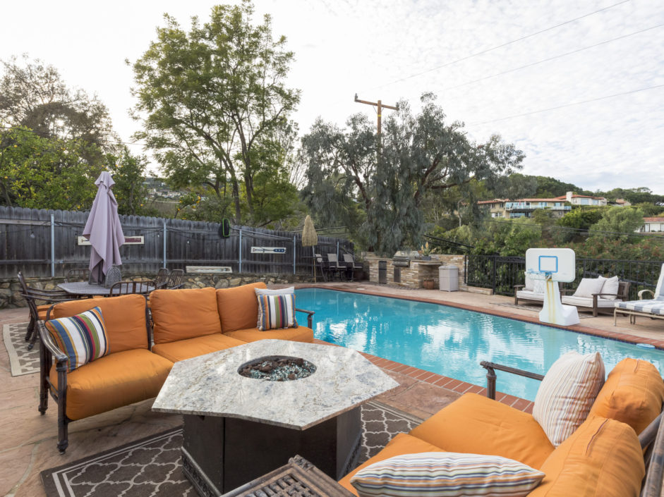 Nestled in the prestigious Miraleste Red Tile Roof Section. You will find this lovely remodeled home with over 2480 sq. ft. of living space. This tree-lined street is one of the best kept secrets in Rancho Palos Verdes. The open floor plan with travertine and bamboo floors is a must see. Recently completed with a new gourment granite kitchen with richly appointed dark cabinets and new stainless steel Kitchen Aid frig and ove, custom glass cook top and European dishwasher. Family room has custom fireplace with built-in book shelf and custom built-in flat screen TV. Huge master suite with walk-in closet, spa tub, travertine shower, double sinks. 2 fireplaces, A/C, new rod iron and wood fences, new windows and doors thru-out with custom hardware. New pool and large pool deck made from flagstone. Custom built outdoor granite stone inlaid kitchen with BBQ, and frig.